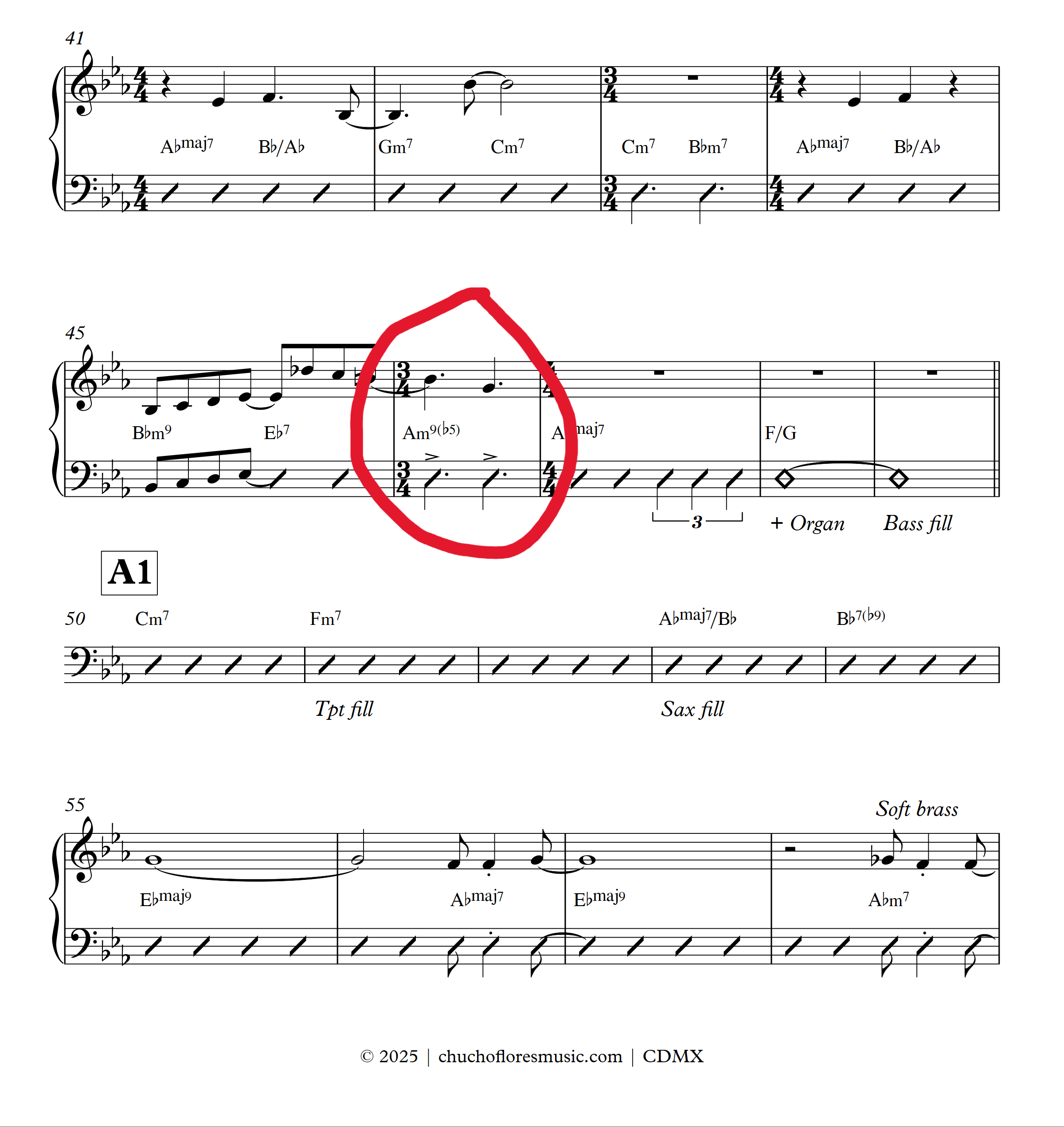 El punto más interesante desde el análisis armónico ocurre en el compás 46. En un escenario funcional estándar, la progresión esperada sería: